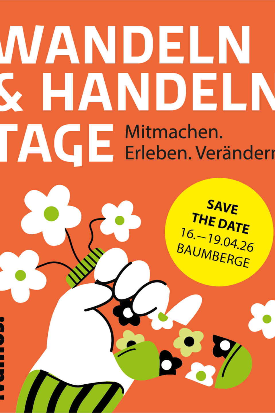 Wandeln & Handeln - die Baumberge bewegen sich! Die Wandeln & Handeln Tage 2026 in den Baumbergen laden zu Tagen voller Begegnungen, Impulsen und Aktivitäten ein. Ob Workshops, Vorträge, Radtouren oder andere kreative Aktionen, wie eine faire Modenschau oder Upcycling-Workshops – hier ist für alle etwas dabei. Die Tage sind ein mehrtägiges Mitmachfestival rund um Themen wie nachhaltiges Leben, faire Arbeitsbedingungen und Gemeinwohl. Alles dreht sich rund um Klamotten, Blumen und Pflanzen.