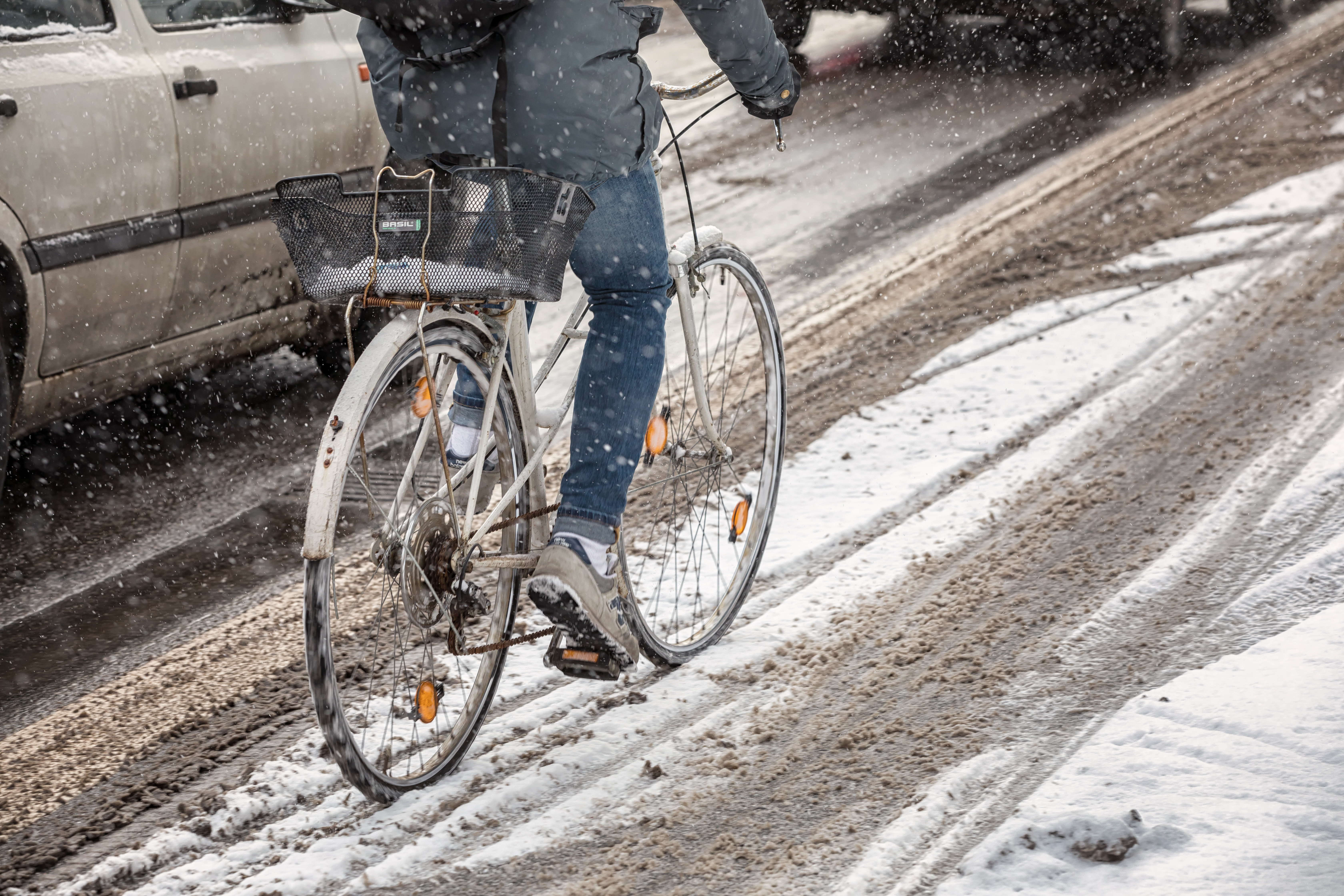 Bei Glätte sollte man keine engen Kurven fahren, schon vor der Kurve bremsen und dann möglichst kontrolliert weiterrollen, ohne zu treten. Zusatztipp: Wer etwas Luft aus den Reifen lässt und nur mit dem Mindestdruck fährt, hat mehr Auflagefläche und damit auch mehr Grip auf der Straße.